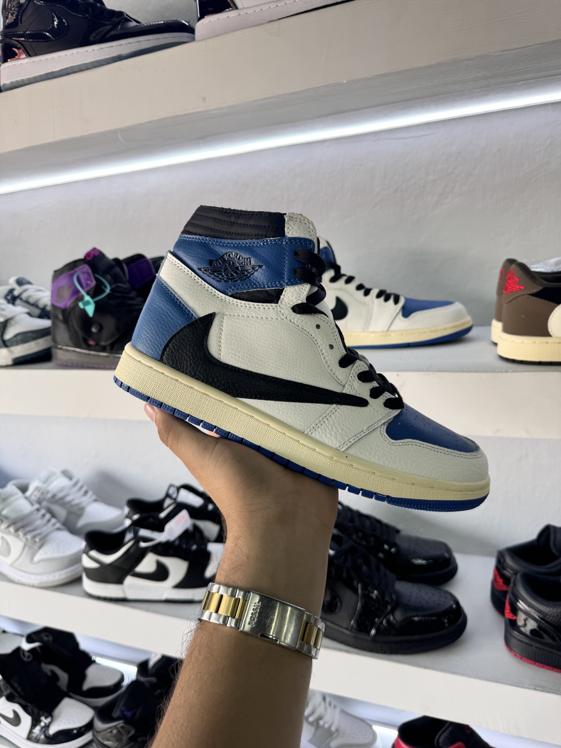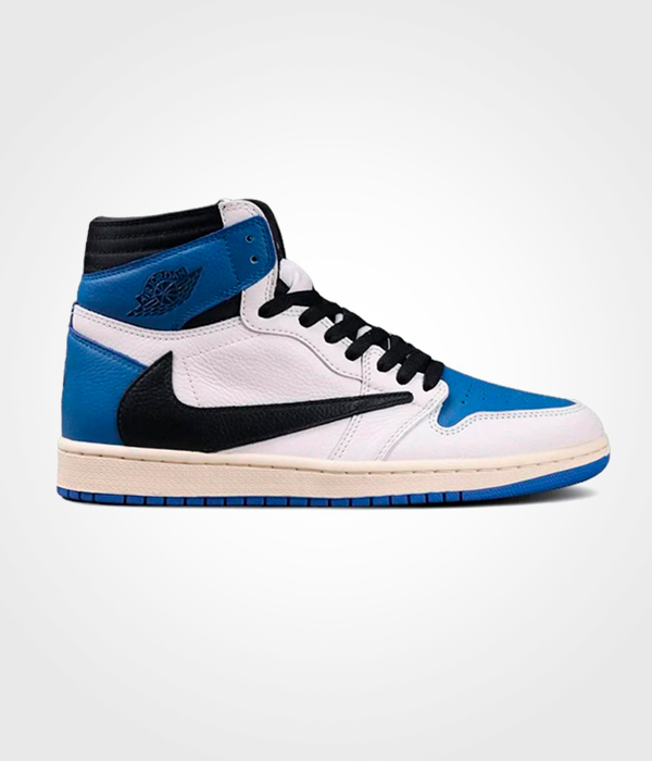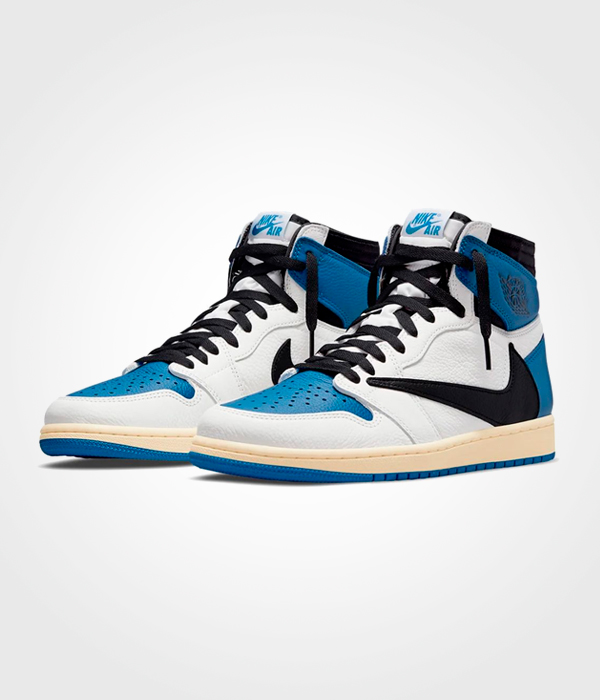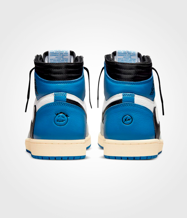 Los Air Jordan 1 High OG SP Fragment Design x Travis Scott se inspiran en la muestra para prensa de 1985 con el upper en piel curtida blanco y azul. De manera similar a las Travis Scott Jordan 1 anteriores, el diseño clásico se completa en este diseño clásico con Swooshes invertidos y bolsillos ocultos en el cuello.